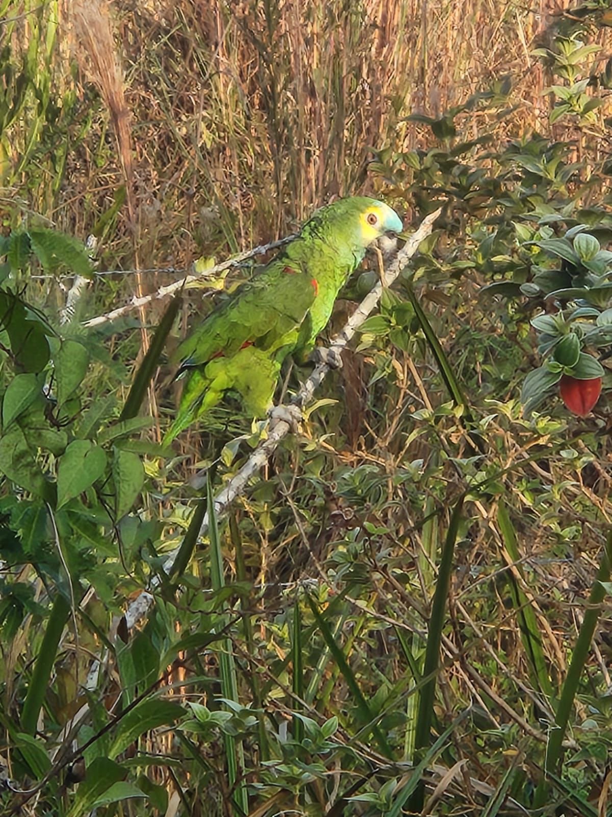 IA Refined "O animal é um papagaio com plumagem predominantemente verde, apresentando manchas amarelas na região da face e cabeça. Possui um bico curvo característico da espécie e marcas avermelhadas nas asas. Nas imagens, ele aparece empoleirado em galhos, demonstrando uma postura alerta."